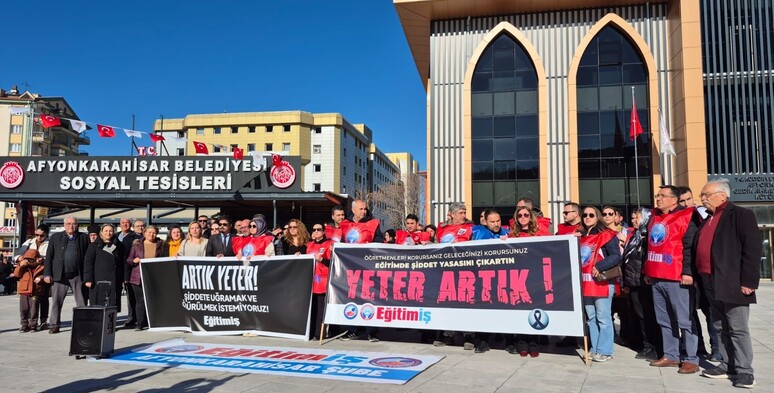 Eğitim-İş Afyonkarahisar Şubesi tarafından Fatma öğretmenimizin katledilmesine tepki amacıyla Zafer Meydanı’nda düzenlenen basın açıklamasına; İl Başkan Yardımcılarımız Sayın Ahmet Karakuzu, Sayın Özden Önerdilek, Sayın Ahmet Salih Çiçek, Kadın Kolları Başkanımız Sayın Nazan Aksu ve örgüt üyelerimizle birlikte katılım sağladık. Eğitim emekçilerine yönelik artan şiddetin siyasi sorumluluğunu görmezden gelen anlayışı kabul etmiyoruz. Okulların güvensiz hale getirilmesine, öğretmenlerin yalnız bırakılmasına ve şiddetin sıradanlaştırılmasına karşı duruyor; öğretmenlerimizin her koşulda yanında olduğumuzu bir kez daha güçlü şekilde ifade ediyoruz.